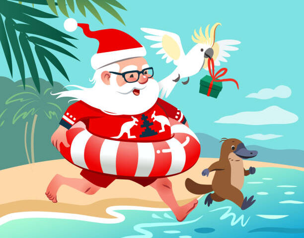 Cute happy Santa Claus running into ocean on a sandy beach in Australia with platypus and sulphur-crested cockatoo with palm trees in background. Aussie Christmas vector illustration for greeting cards, seasonal decor.